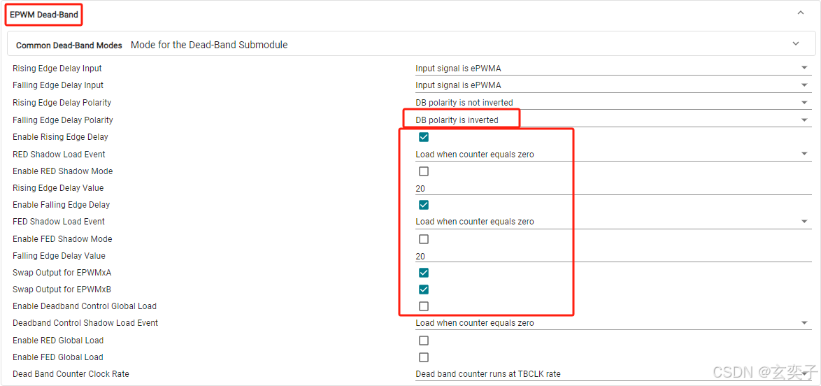 DBCTL:死区输出模式、极性配置、输入源选择。