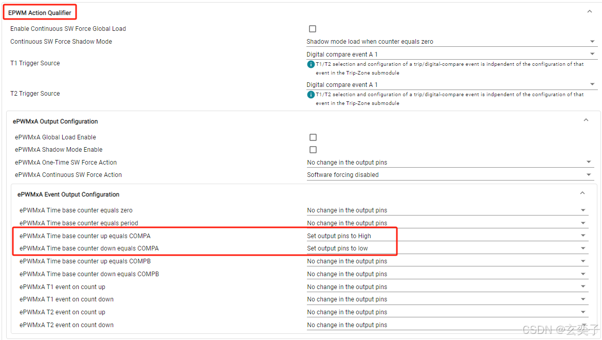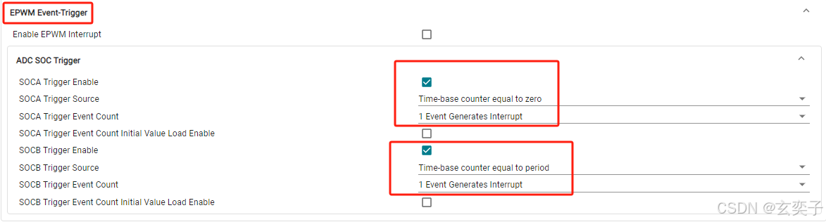 用于配置何时触发中断(EPWMxINT)或 ADC 转换(SOCA/B)。