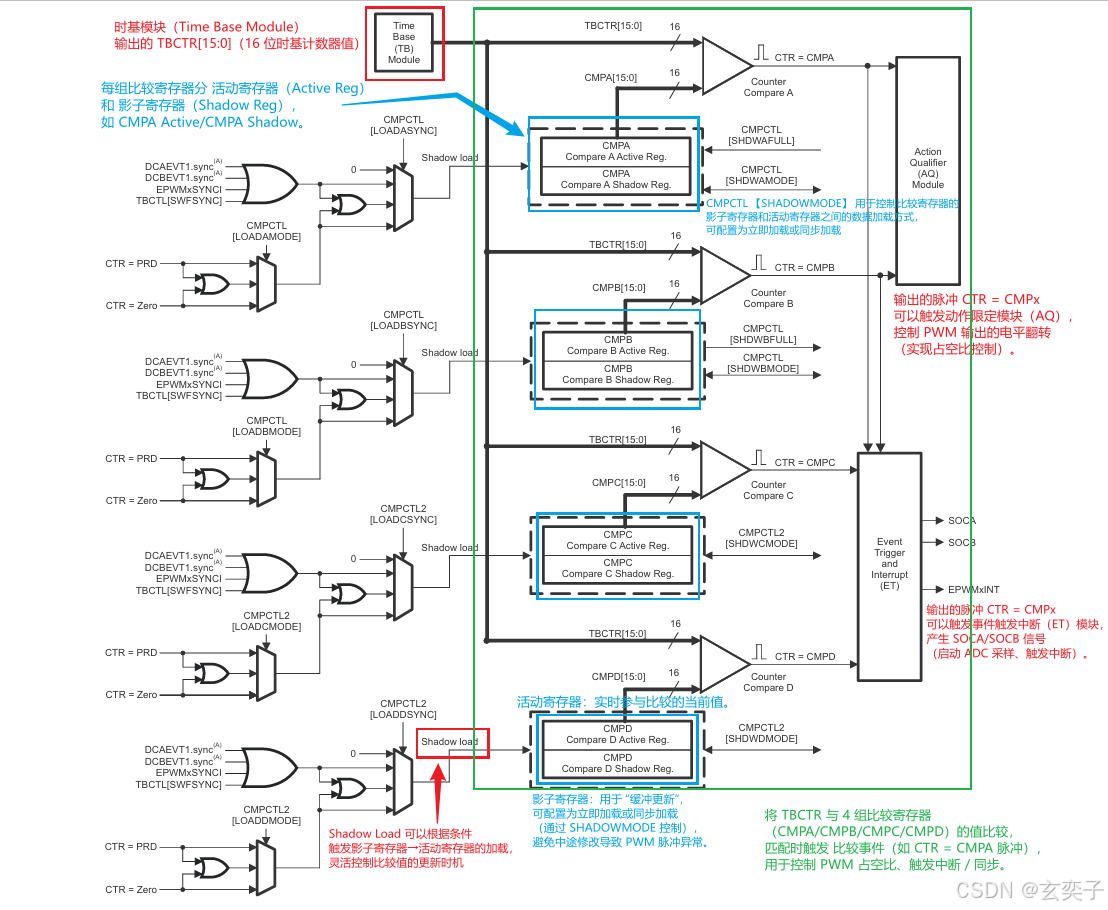 用于设置 PWM 的占空比,通过比较器 CMPA~CMPD 与 TBCTR 比较生成事件。
