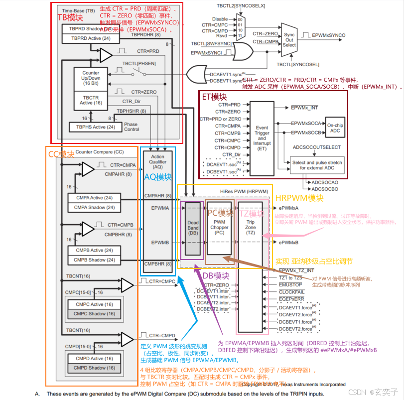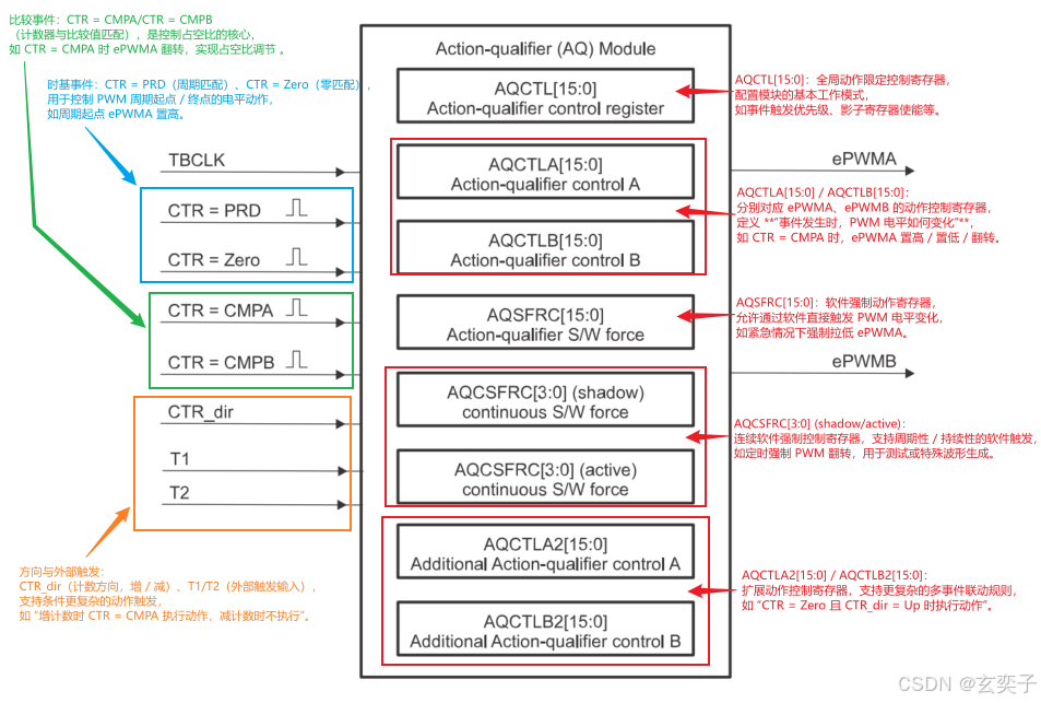 **动作限定器模块 (AQ):**根据比较结果或触发条件控制 ePWM 输出高低电平或翻转。
