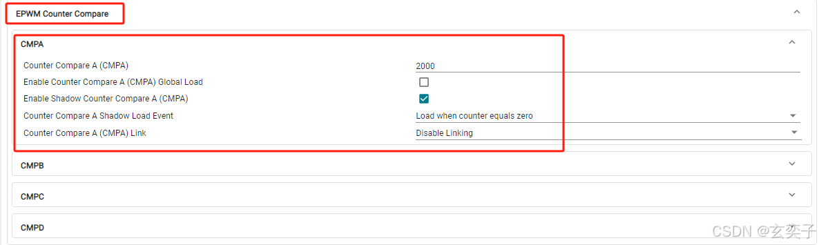CMPA/CMPB 控制实际输出波形,占空比调节;CMPC/CMPD 常用于触发 ADC 或中断。