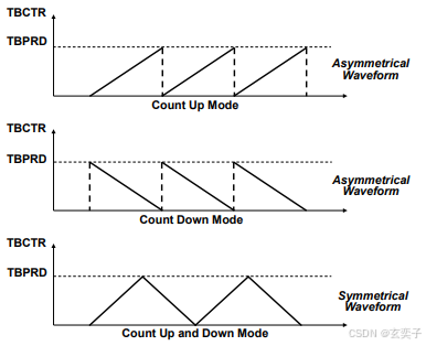 时基计数器可以使用以下三种模式之一运行:向上计数、向下计数和向上向下双向计数。请注意,向上计数和向下计数模式用于产生非对称波形,而向上向下双向计数模式用于产生对称波形。