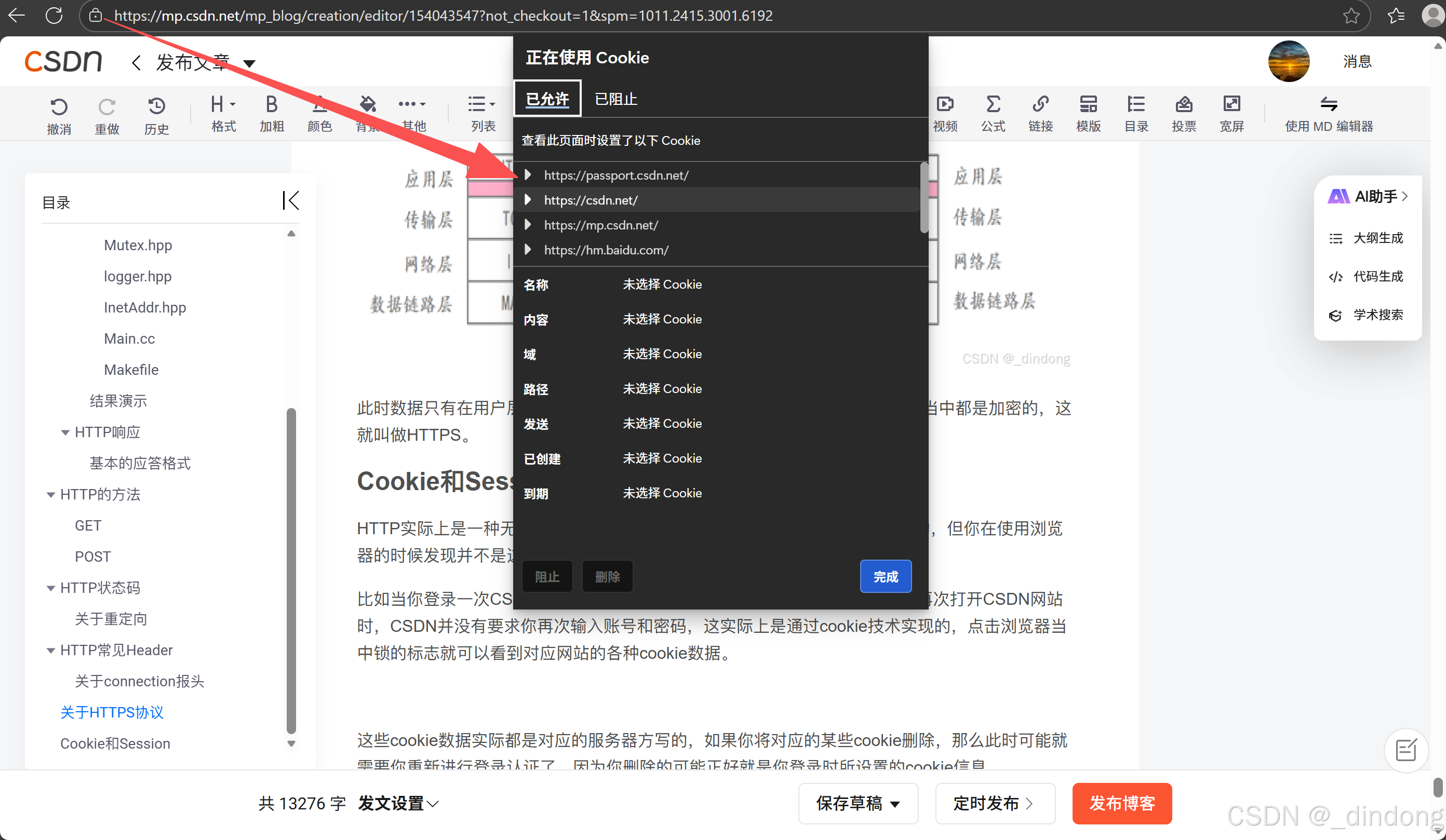 比如当你登录一次CSDN后,就算你把CSDN网站关了甚至是重启电脑,当你再次打开CSDN网站时,CSDN并没有要求你再次输入账号和密码,这实际上是通过cookie技术实现的,点击浏览器当中锁的标志就可以看到对应网站的各种cookie数据。