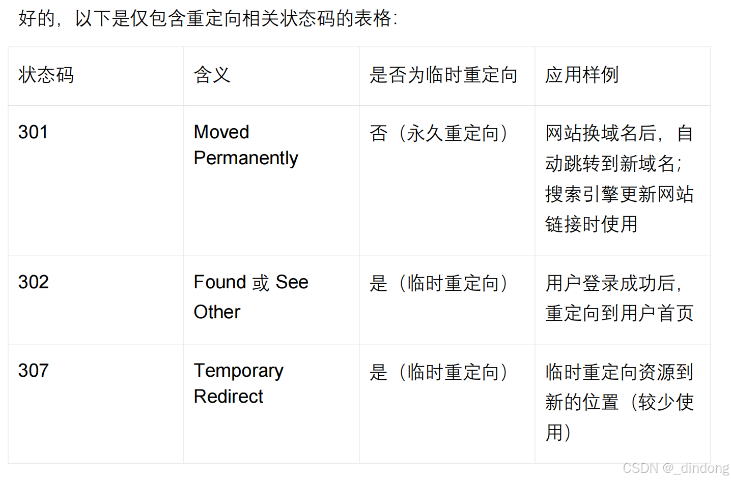 • 在这种情况下,服务器会在响应中添加一个 Location 头部,用于指定资源的新位置。这个 Location 头部包含了新的 URL 地址,浏览器会自动重定向到该地址。