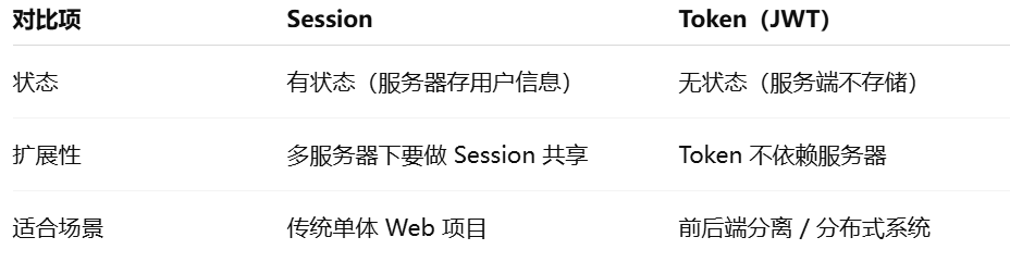 因为 JWT(JSON Web Token)是一种无状态认证方式,不需要服务器存储 session,比较适合前后端分离项目。