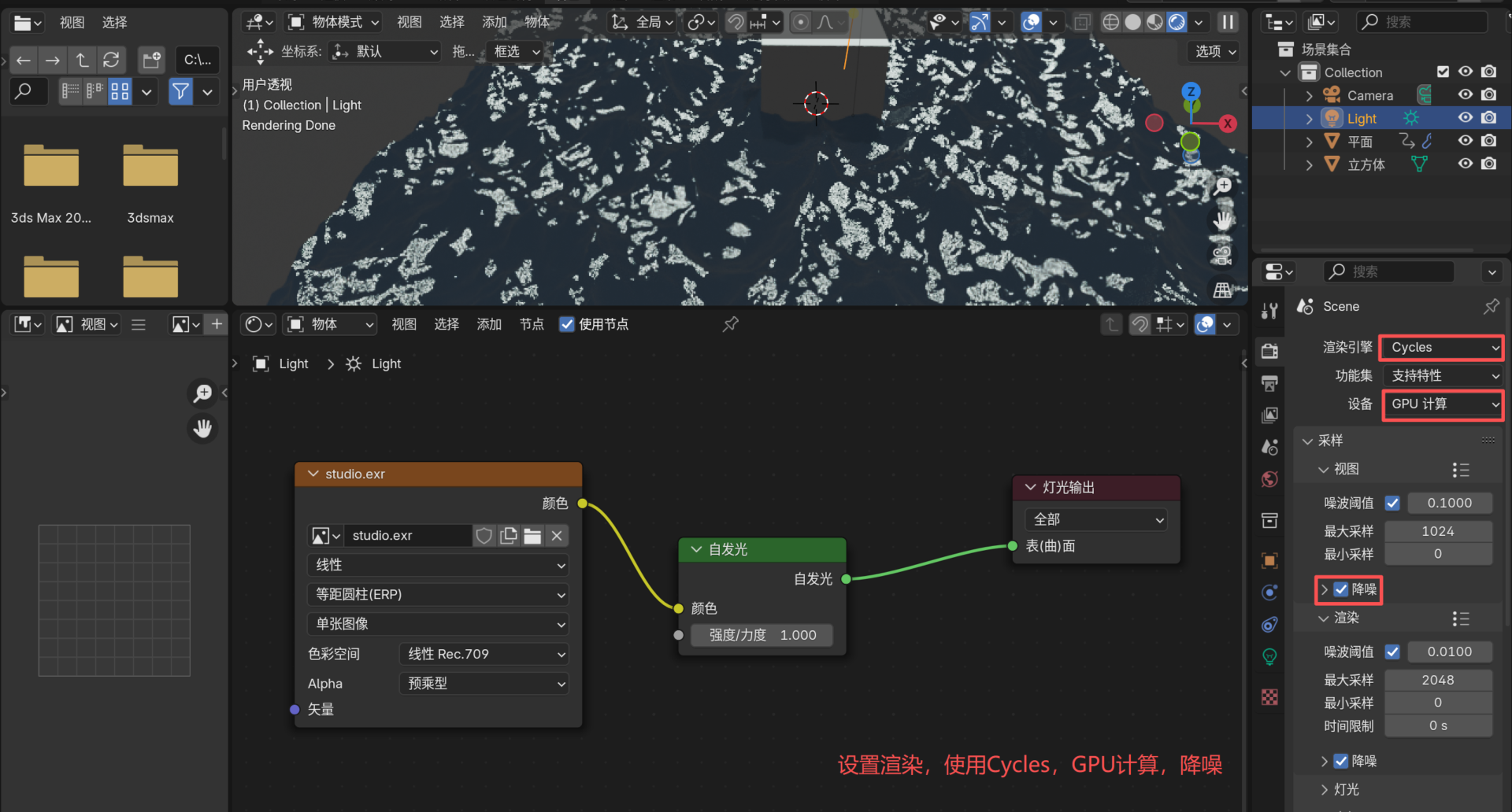 渲染器使用cycles,设备为GPU计算,勾选降噪。
