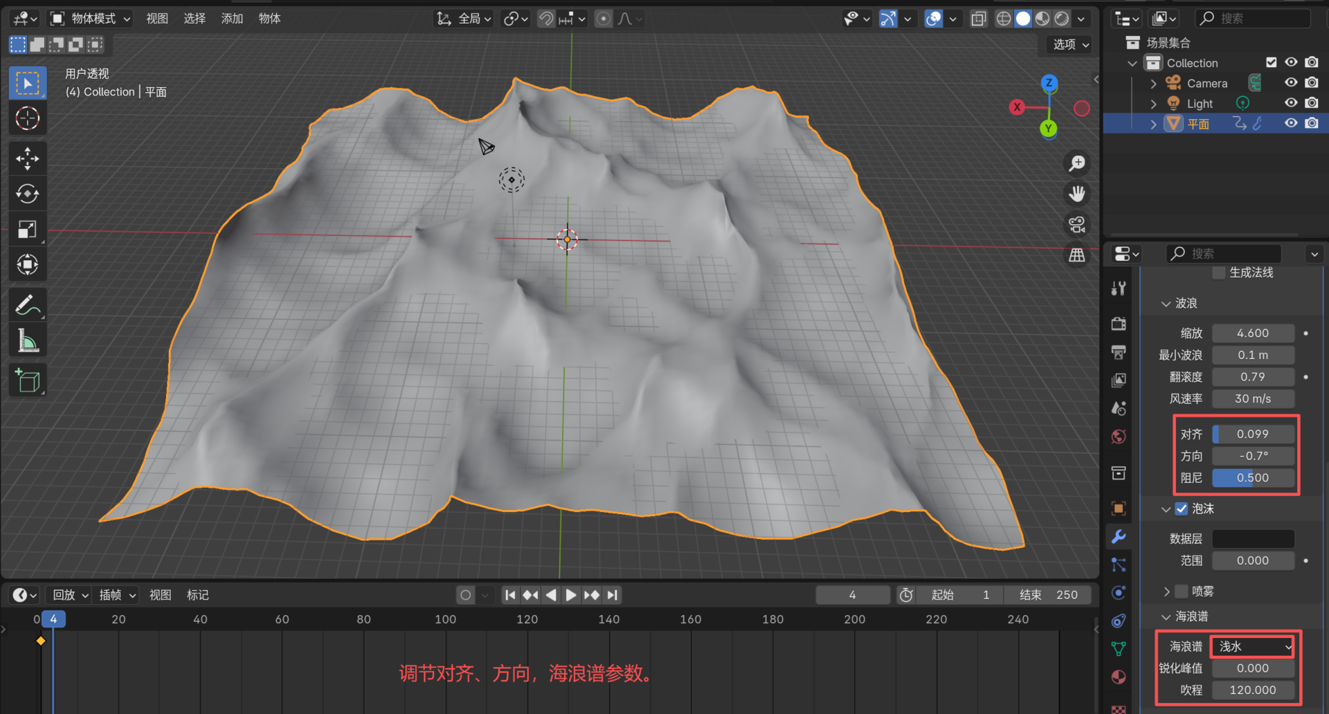 对齐:调小让波浪不规范,方向、阻尼:在此基础上更改波浪形状,海浪谱:波浪的形状,先有这个,调节前边的参数才有效。