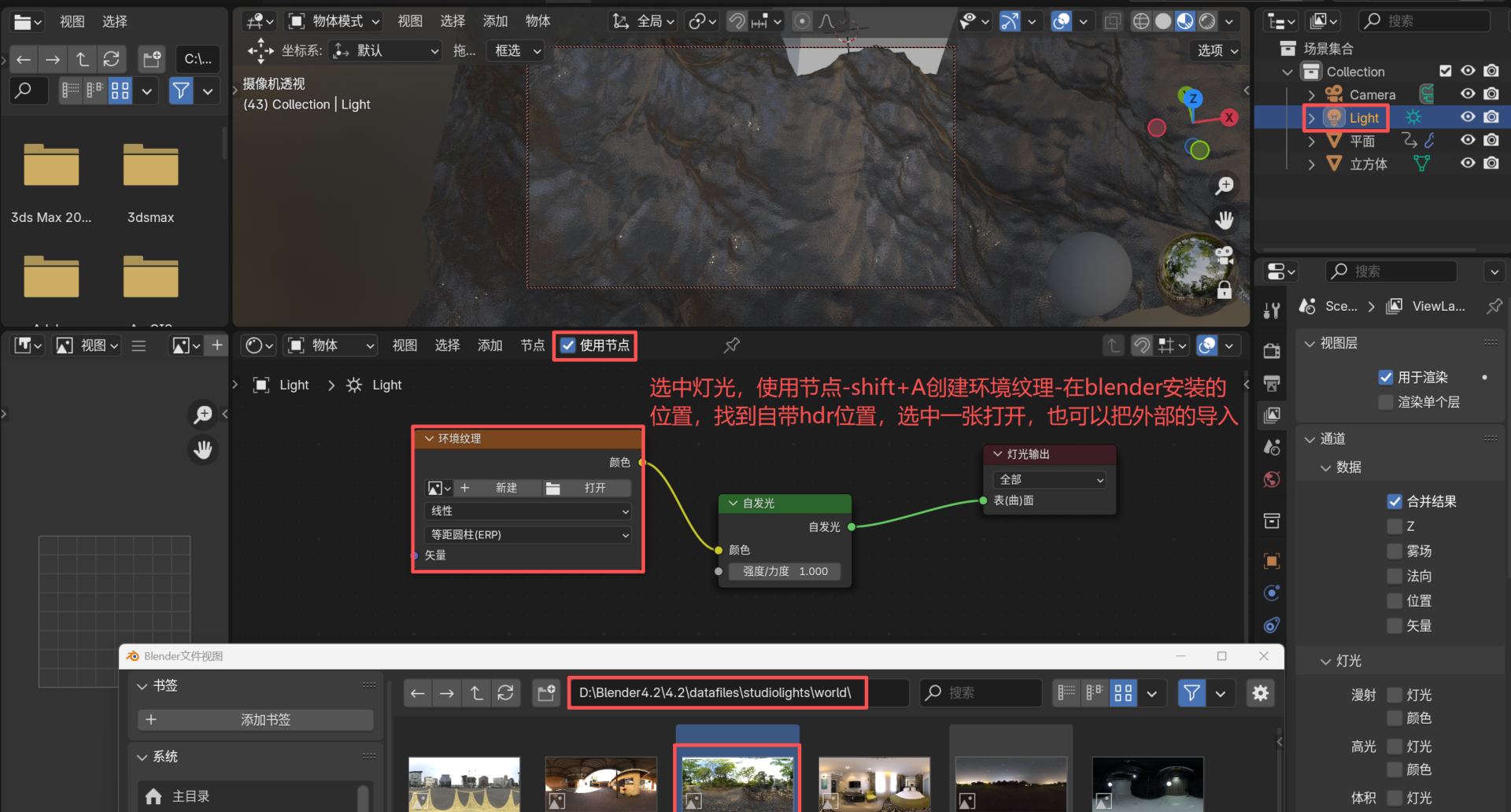 调节灯光,给其添加天空盒,这里使用Blender自带的就行。