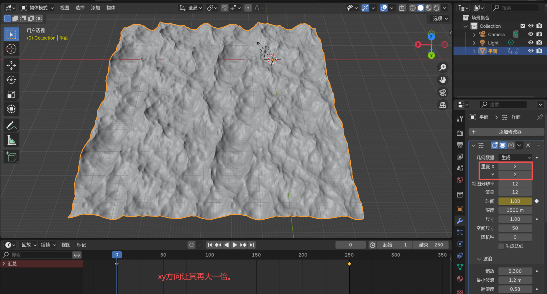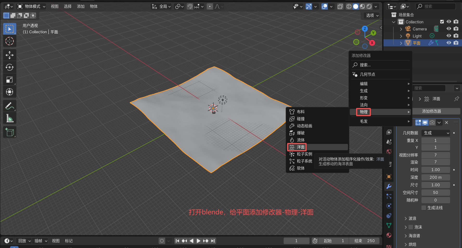 打开Blender,shift+A新建平面,然后给平面添加一个物理-洋面修改器。