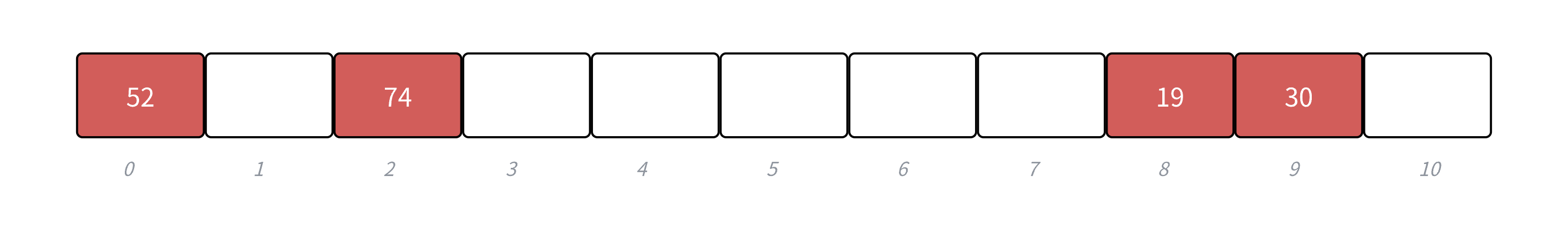 - 下⾯演⽰ {19,30,52,63,11,22} 等这一组值映射到M=11的表中。