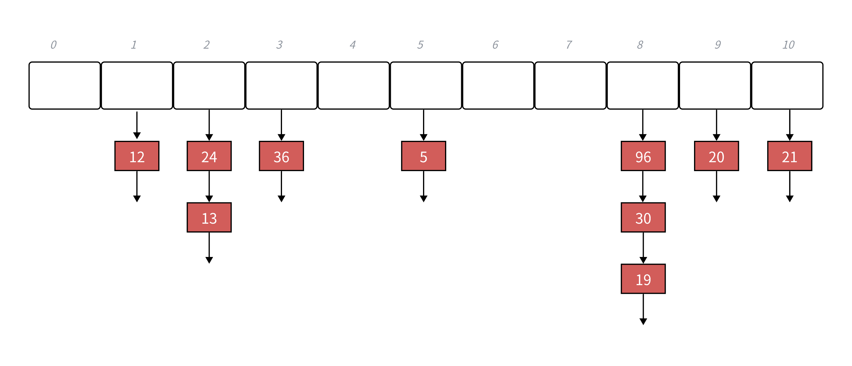 下面演示 {19,30,5,36,13,20,21,12,24,96} 等这一组值映射到M=11的表中
