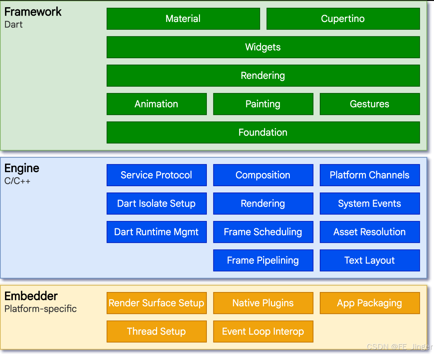如果你是刚开始用 Flutter:先理解 框架本身三层(Embedder → Engine → Framework),知道为什么 Flutter 可以跨平台且性能优越。