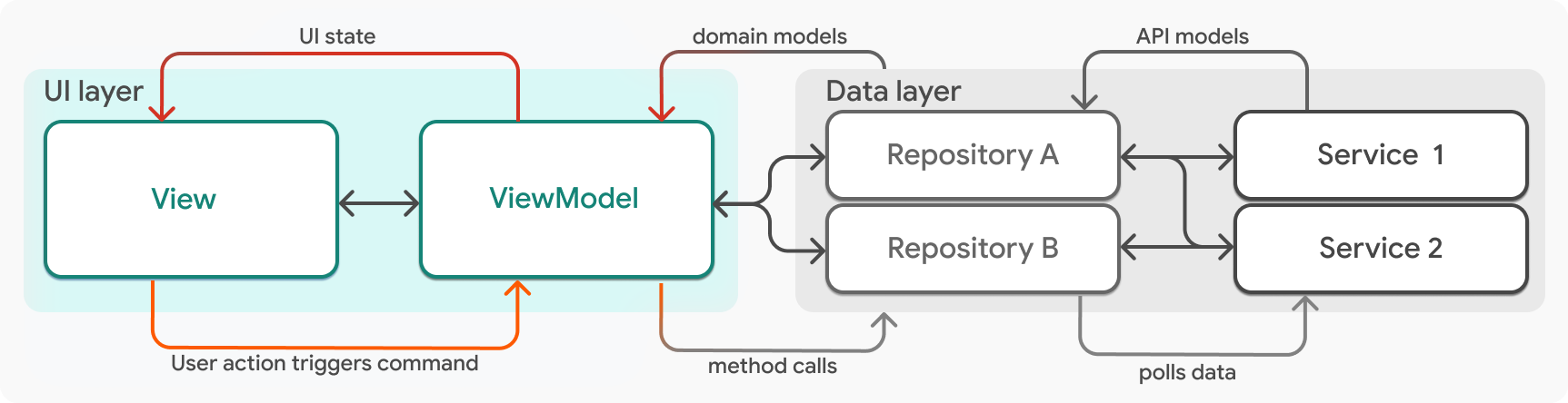- 举例:CartService(应用层)会调用 CartRepository,从数据层获取数据,然后在 ViewModel 中将其转换为 UI 模型(如
