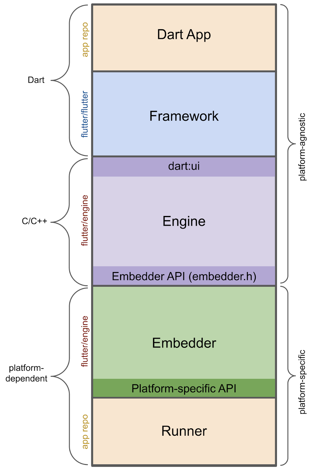 - 它的语言实现依平台而异:Android 通常 Java/Kotlin + C++,iOS/macOS 为 Objective-C/Swift + C++,桌面为 C++ 等。 (docs.flutter.dev)