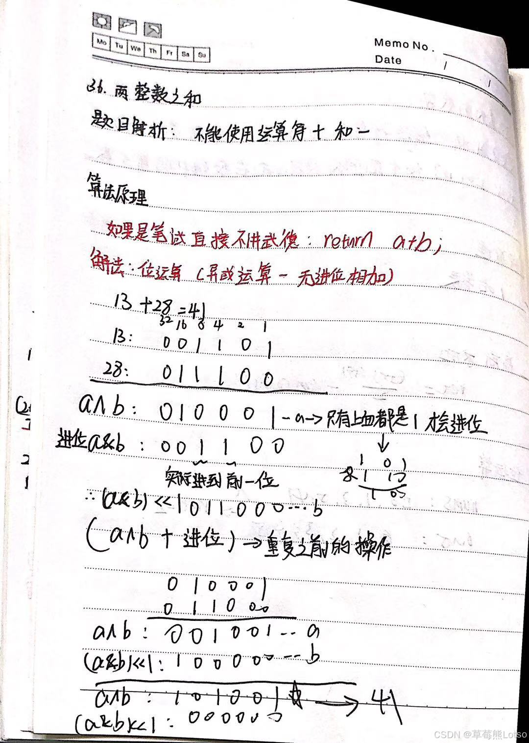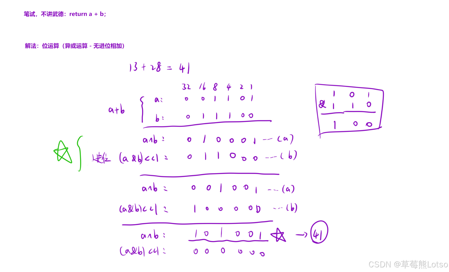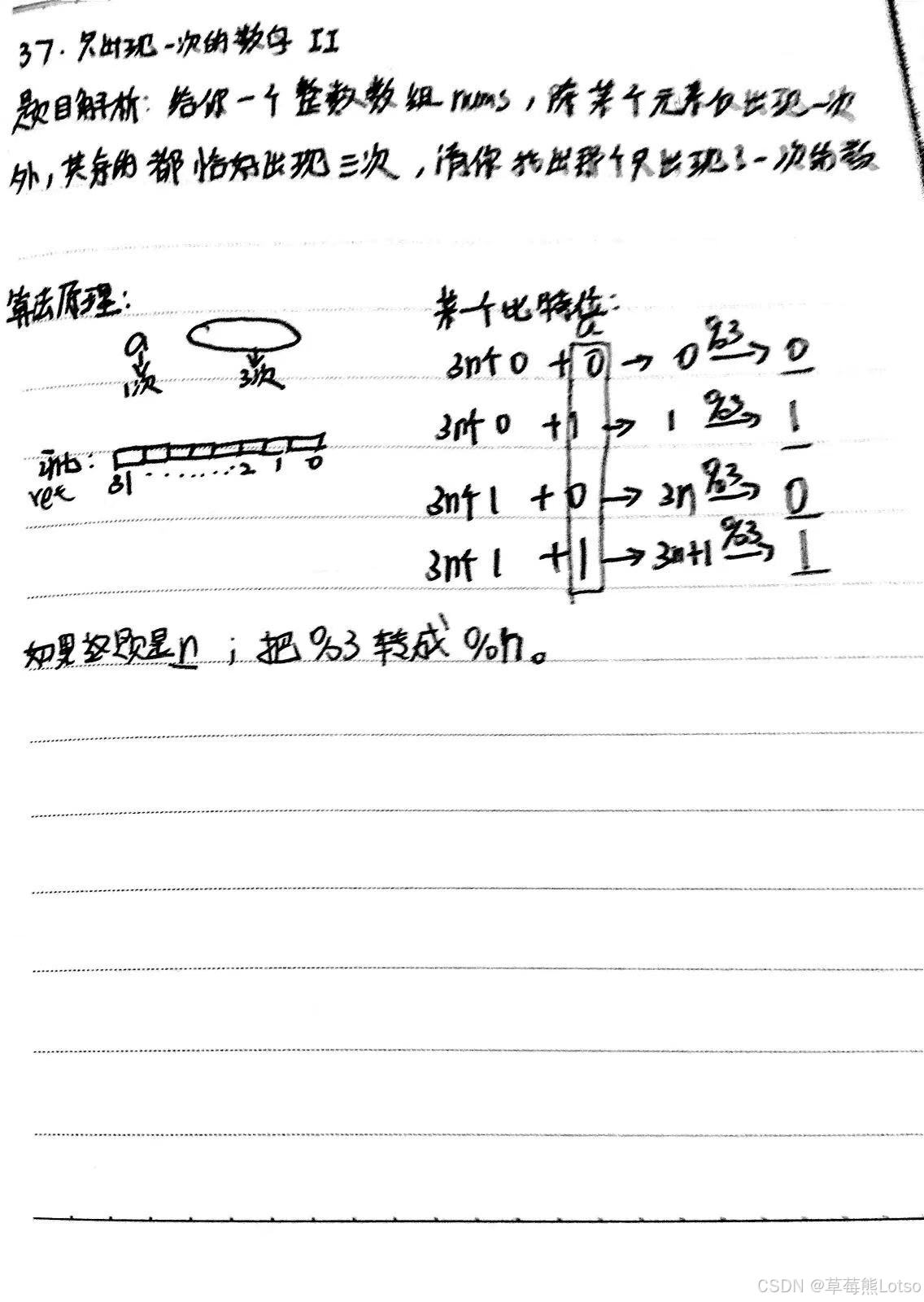 结语:本文精选两道经典位运算算法题,深入解析解题思路与实现代码。第36题通过异或和按位与操作实现无进位加法,循环处理进位直至为零,高效求解两数之和(371. 两整数之和)。第37题利用比特位计数技术,统计所有数字各二进制位出现次数,模3结果定位唯一出现一次的数字(137. 只出现一次的数字 II)。代码均附详细注释,配以手写笔记图解关键步骤,帮助读者掌握位运算核心技巧。