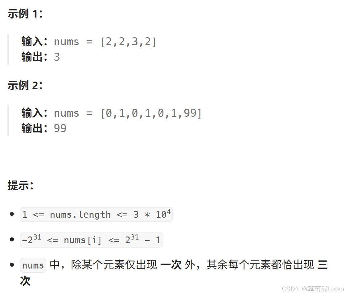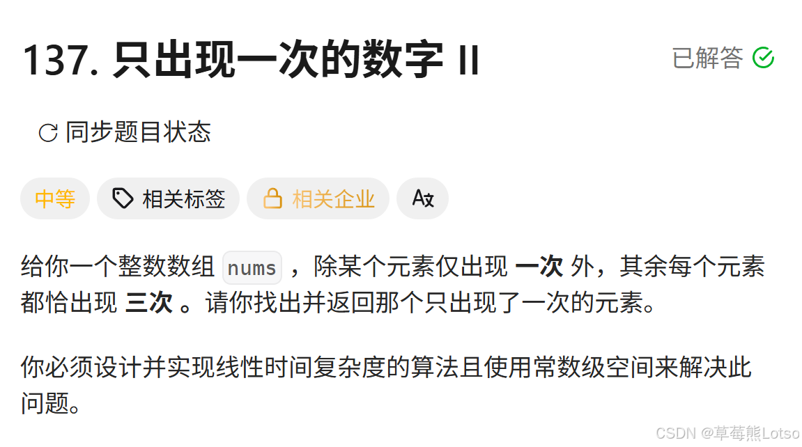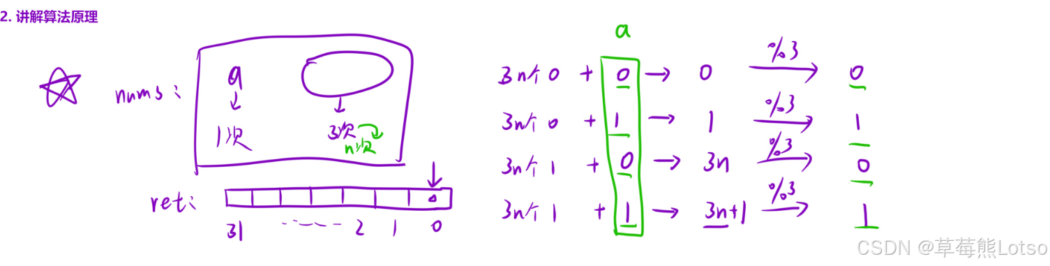 由于整个数组中,需要找的元素只出现了【一次】,其余的数都出现【三次】,因此我们可以用根据所有数的【某一个比特位】的总和 %3 的结果,快速定位到 ret 上的【一个比特位上】的值是 0 还是 1。