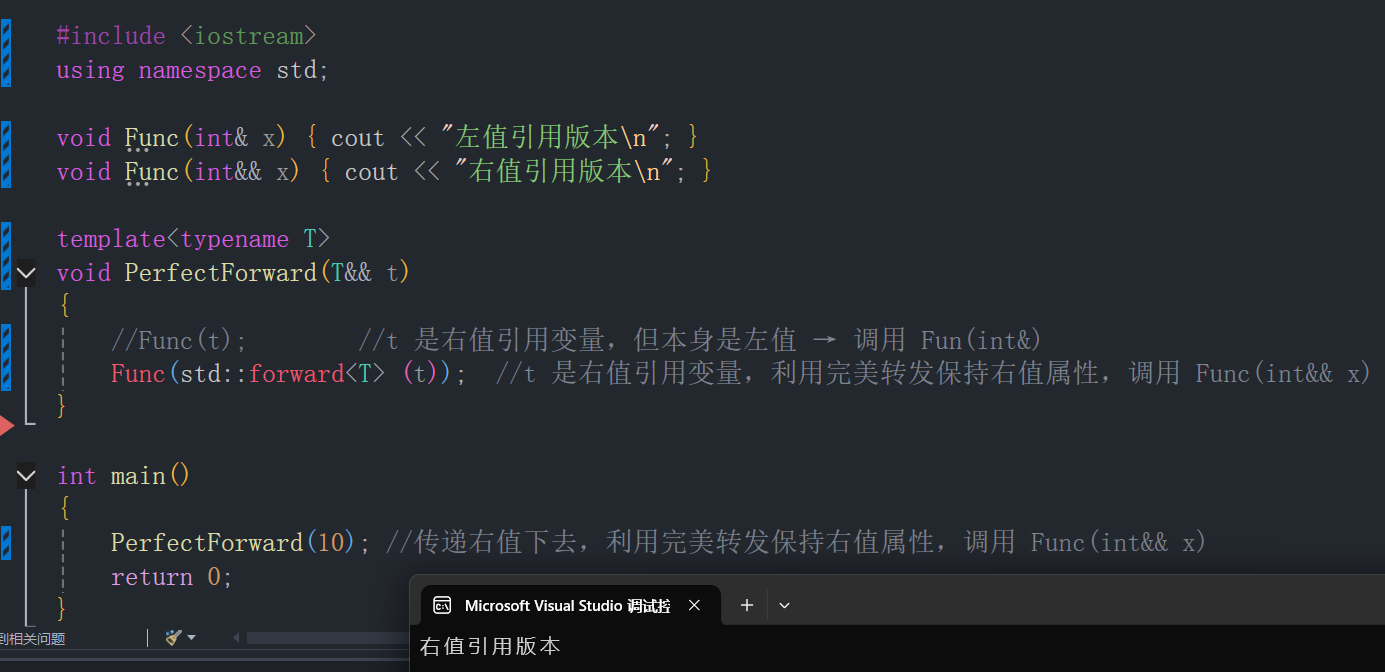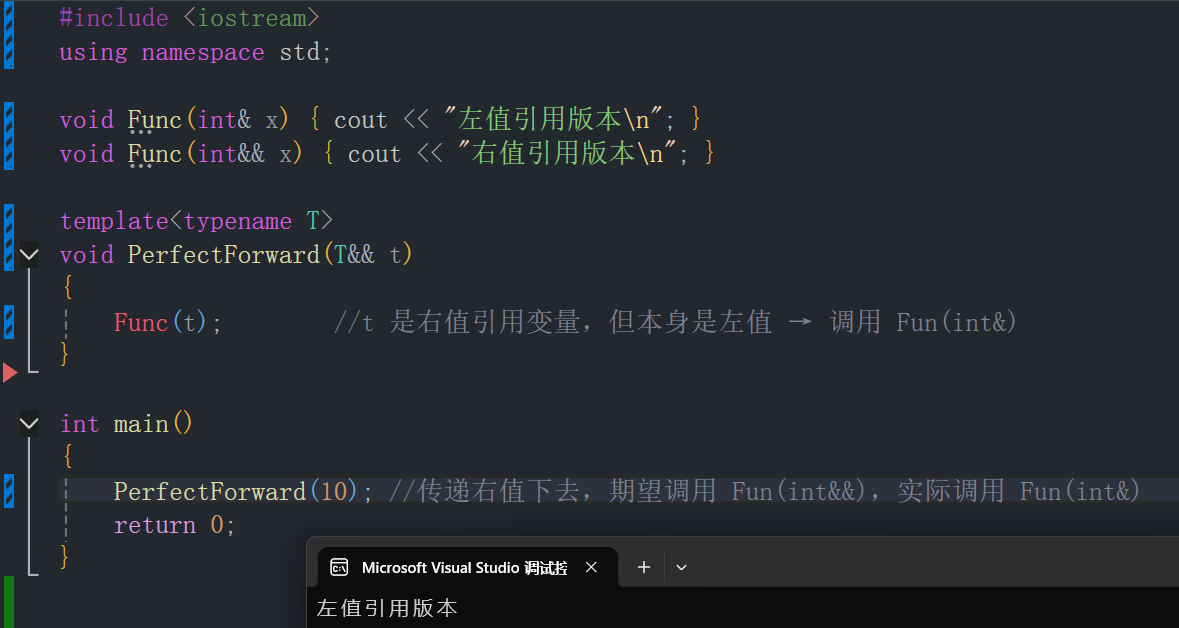 PerfectForward(10); //传递右值下去,利用完美转发保持所引用的右值对象的右值属性,调用 Func(int&& x)