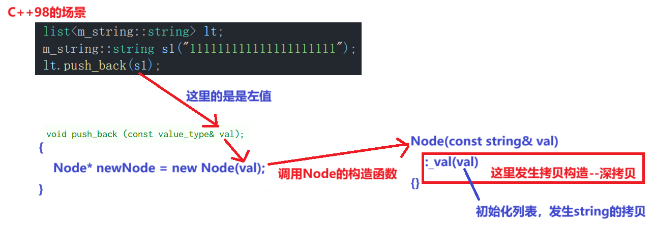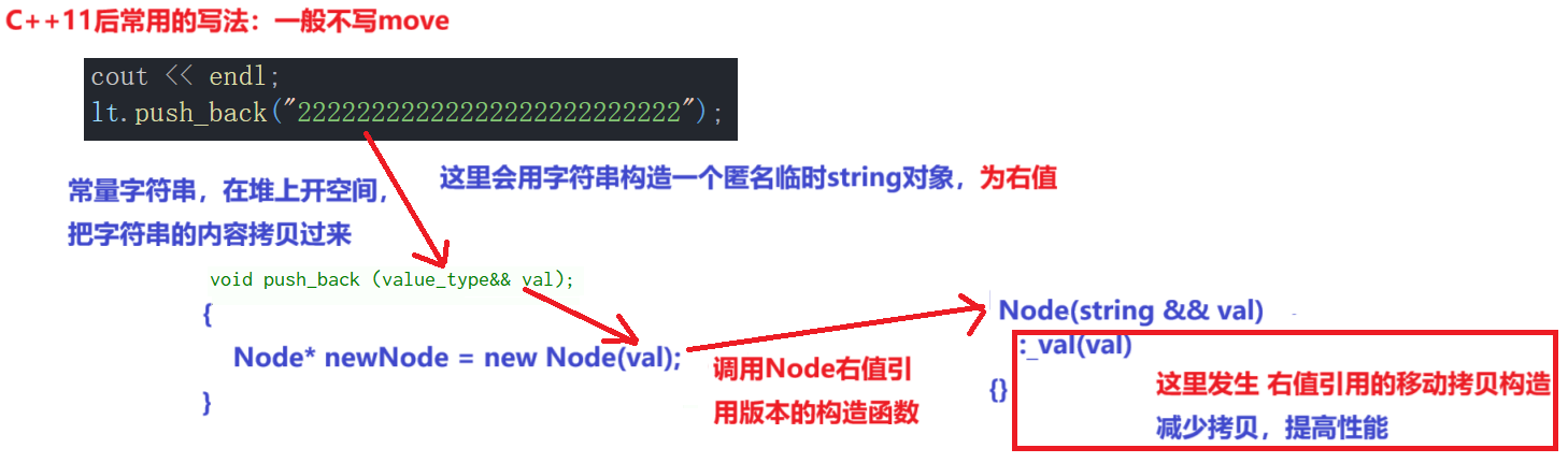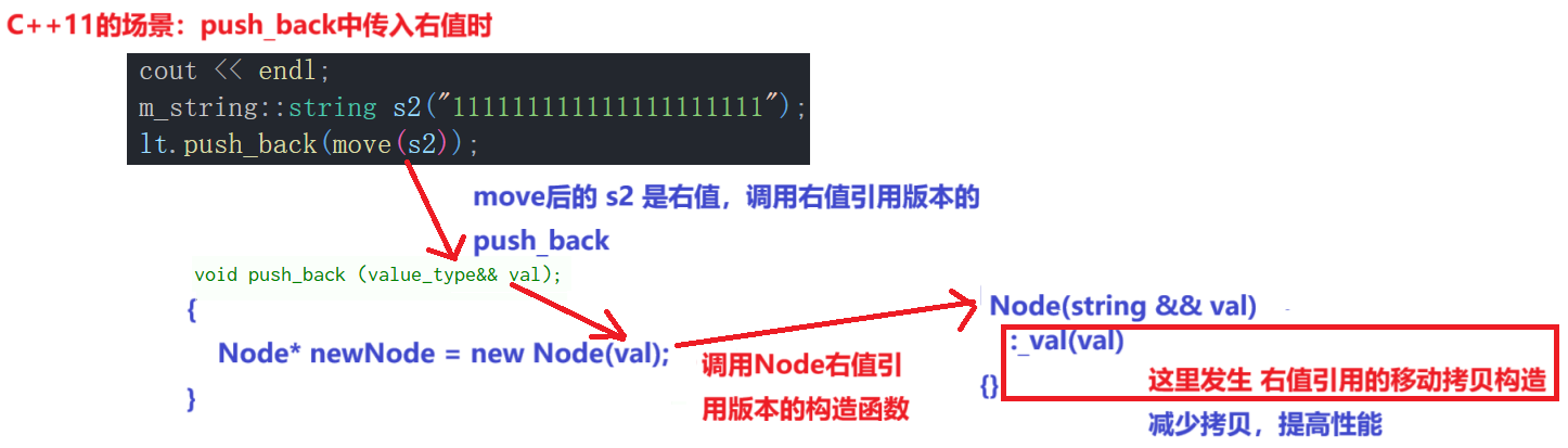 push_back,而push_back是借助insert实现的,push_back函数中将待插入的值传递到了insert函数中去。而右值引用变量本身是左值 ,如果想调用右值引用版本的insert函数,需要在push_back向insert传参时使用完美转发,保持对象的右值属性 ,才能匹配到右值引用版本 的insert函数 insert中,右值引用val被向下传递给了Node的构造函数,我们期望调用右值引用版本 的Node构造函数,因此同样需要使用完美转发向下传递参数Node的构造函数对val使用初始化列表初始化成员变量_val,会调用_val类型的默认构造进行初始化,为了确保能够调用右值引用版本的移动构造 ,传参时需要使用完美转发保持val对象的右值属性