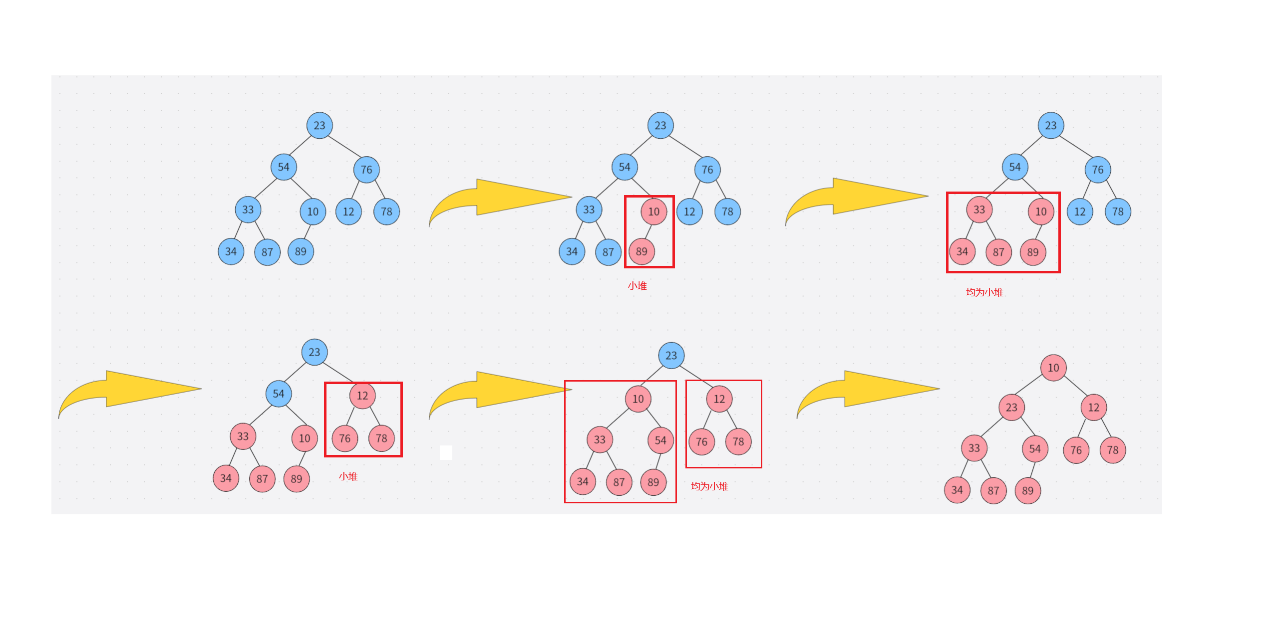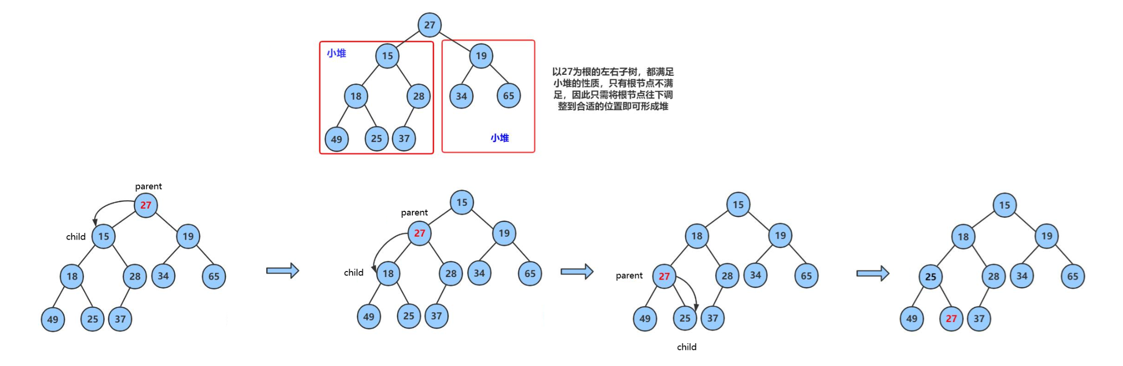 - 若想将其调整为小堆 ,那么根结点的左右子树必须都为小堆。