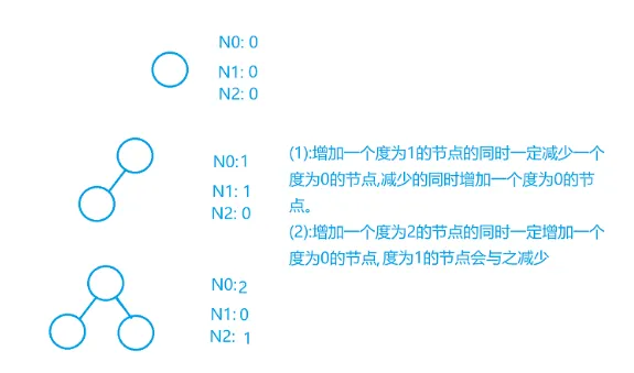 对任意一棵二叉树 ,若度为0其叶节点个数为n0,度为2的分支结点个数为n2,则存在n0 = n2 + 1;(增加一个度为2的一定会增加一个度为0的)
