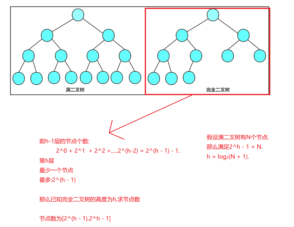 若规定根节点的层数为1,则深度为h的二叉树的最大节点数 为2^h - 1**(满二叉树).**