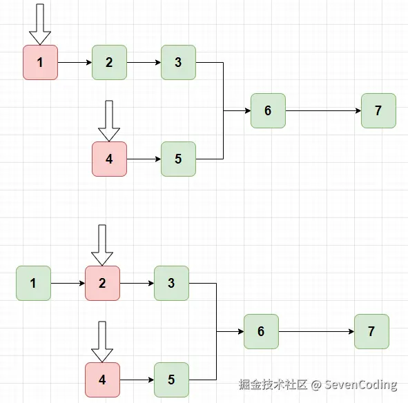 最直接的⽅法,每⼀个链表都遍历⼀次,计算链表中的个数,⽐如 1->2->3->6->7 个数为5, 4->5->6->7 个数为4,两者相差1(设为k)个。