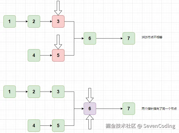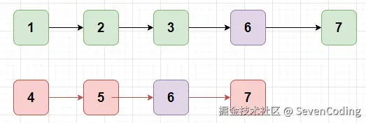 譬如现在有⼀个链表 1->2->3->6->7 ,另外⼀个链表 4->5->6->7 ,明显可以看出第⼀个公共节点是6 。