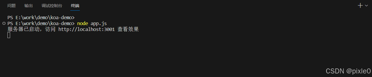 这段代码很简单,核心4步,引入Koa,创建实例,定义中间件并设置响应体,在3001端口启动服务器。