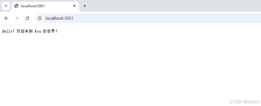 打开浏览器,访问 http://localhost:3001 ,将会看到 "Hello !欢迎来到 Koa 的世界!"的文字输出,