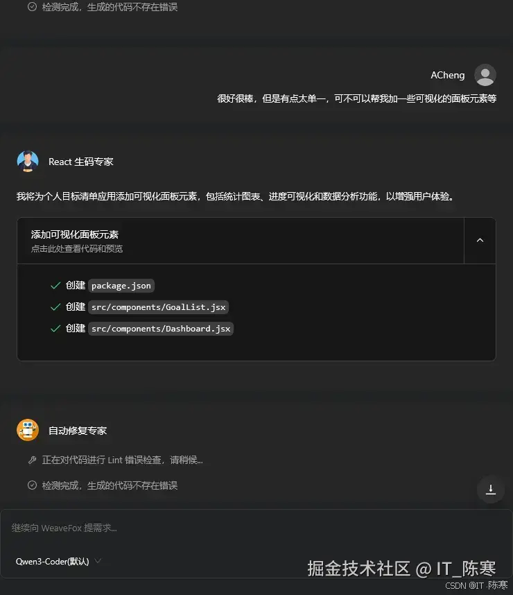 生成完后,我发现功能还不够丰富。我提了个需求:"能不能加一些可视化的面板元素,比如统计图表和数据分析?"