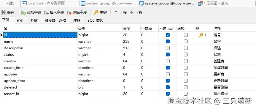 在数据库中设计 system_group 表,作为用户组模块的基础数据载体。