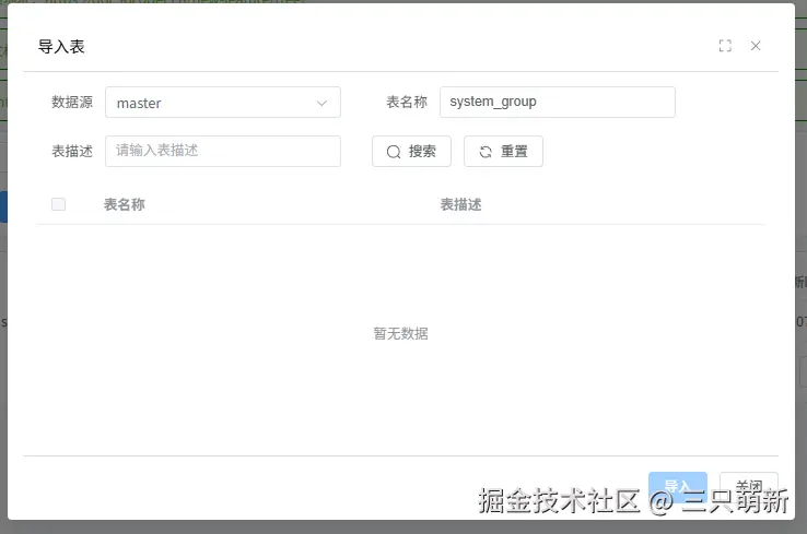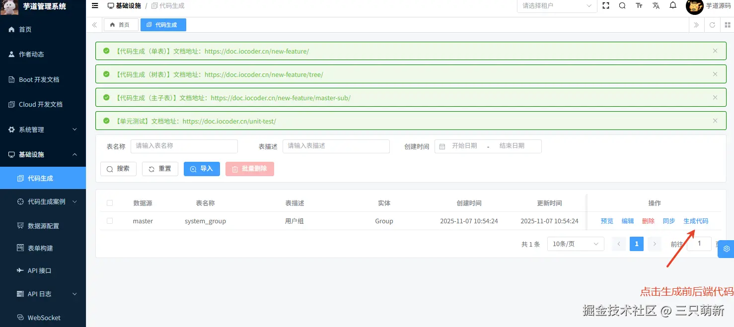 进入管理后天台,先导入我们的设计表 system_group,然后在 "代码生成" 页面找到已设计好的 system_group 表,一鍵生成前后端代码和对应的 sql 文件。