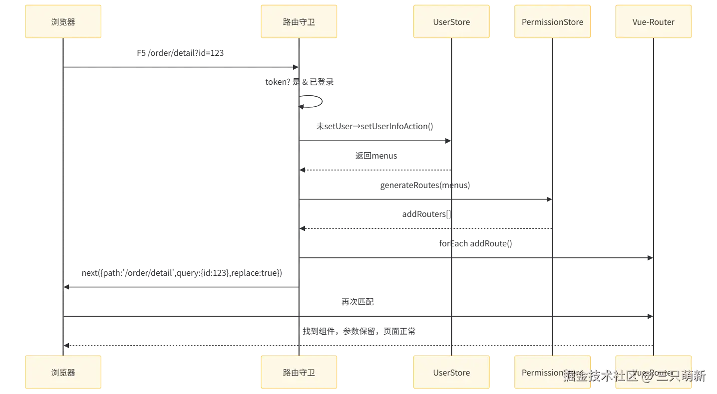 "有 token → 拉用户 → 拼路由 → addRoute → 重跳带参 → 页面正常"