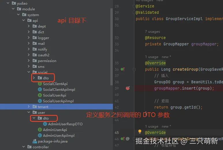 我们先从后端的项目代码来看起,首先来看看项目结构。这边仅列举了 yudao.module.system 包下的内容。这是本次新增用户组功能涉及到的模块。
