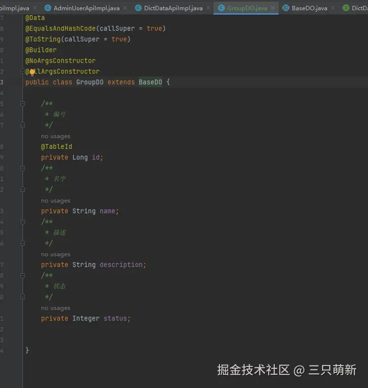 │ │ │ └── GroupDO.java # 系统用户组 DO,映射数据库表 `system_group`,封装用户组的基础字段(如ID、名称、状态等)