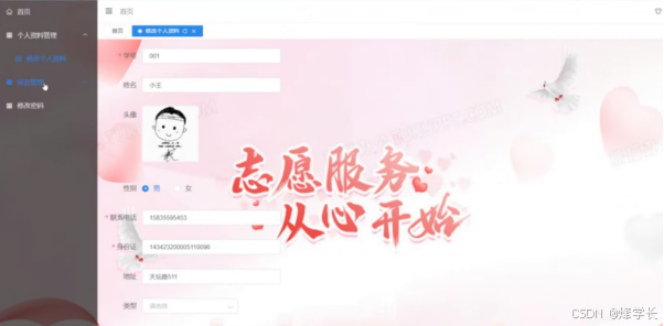登录后,志愿者可以在个人资料管理页面查看和编辑自己的信息,包括用户名、密码、姓名、性别、头像、年龄、邮箱、手机等。这一功能允许志愿者随时更新自己的信息,确保平台上的数据与实际保持一致。