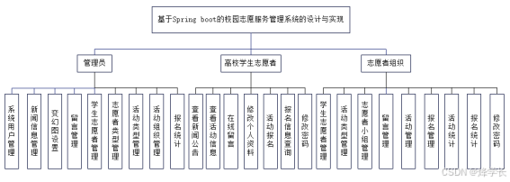 基于Spring Boot的校园志愿者管理系统在总体设计上,充分融合了现代化软件开发的最佳实践,构建了一个功能全面、性能稳定、易于扩展的系统。该系统以用户为中心,设计了直观易用的界面,使用户能够轻松管理个人信息、浏览活动、报名参加等。后端架构采用了Spring Boot框架,利用其简化开发、快速构建和易于部署的特性,有效提升了开发效率和系统稳定性。在数据存储方面,系统选用了高性能的数据库,确保了数据的安全性和快速响应。该系统的设计不仅满足了校园志愿者的基本管理需求,也为后续的功能拓展和版本迭代预留了空间,展现了一个灵活且可持续发展的技术架构。通过这套系统,校园志愿者的招募、管理和活动组织将变得更加高效便捷,有力地支持了校园志愿服务工作的推进。系统结构图如下图4.2所示: