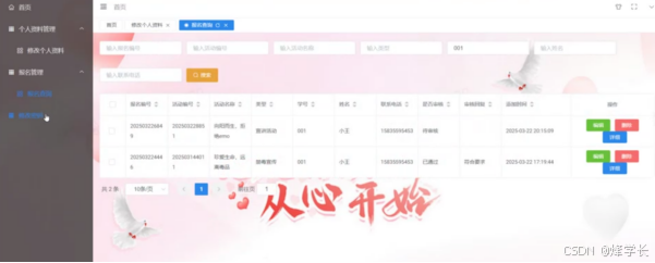 登录后,志愿者可以查看自己的报名信息,包括活动名称以及时间等。这一功能允许志愿者对报名信息进行编辑查询。