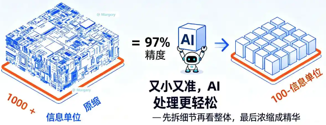 | 处理效果 | 处理长文档时速度慢、成本高,且容易因"记忆体"不足而中断对话或混淆信息。 | 高效且经济 。在保持97%高准确率的前提下,实现了10倍的信息压缩。单张显卡每天可处理20万页文档。 |