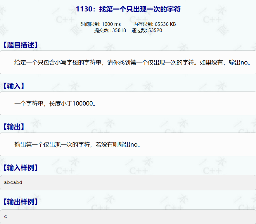 但是发现程序还是不行。然后发现这时会出现次序问题,题目中要求的是第一次出现仅一次的。那么我们可以再遍历一遍字符串,然后找到数量为1的,自然就是第一次出现并且仅出现一次的字符了。并且题目说了字符串长度小于100000,两次都是单层循环,时间也是没什么问题的。