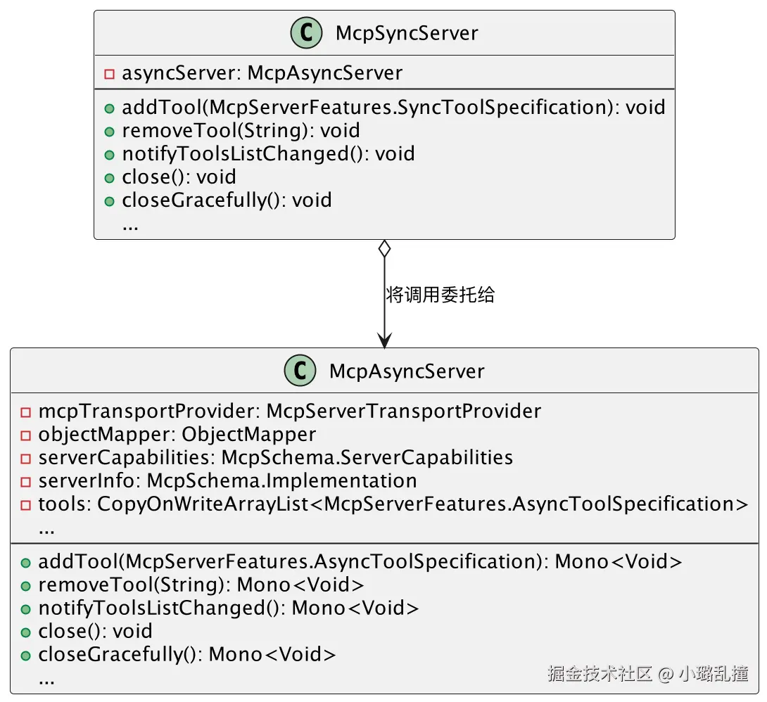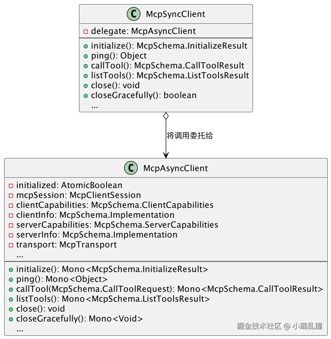 在运行层中,McpSyncClient 和 McpAsyncClient 分别是 MCP 同步客户端和异步客户端的执行核心,它们共同承担了与服务端交互的实际逻辑。从类图中可以看出,同步客户端并没有独立实现实际的业务逻辑,而是通过组合的方式持有一个异步客户端实例,并将所有核心方法调用委托给它执行 。在其源码中,initialize()、ping()、callTool() 等方法都是通过调用异步客户端对应的方法,再通过阻塞的方式获取结果的。也就是说,同步客户端只是异步客户端的一层包装。