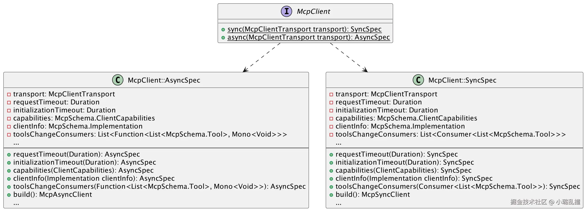 MCP 客户端入口层涉及到的类包括 McpClient 、McpClient.AsyncSpc (内部类)、McpClient.SyncSpec(内部类),如下图所示: