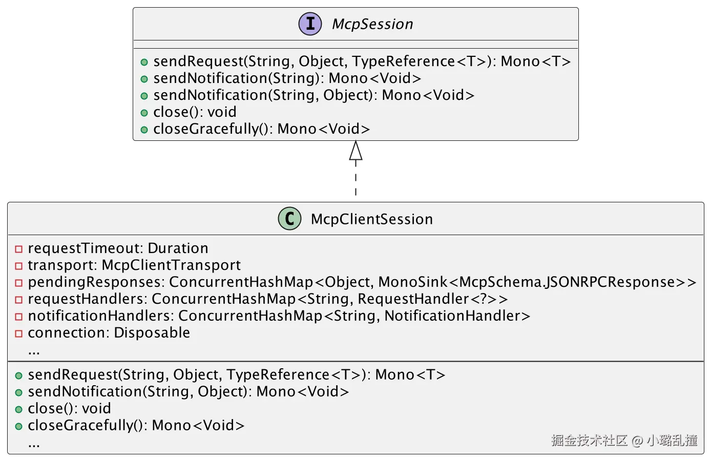 核心接口是 McpTransport 和其子接口 McpServerTransport,其中 McpServerTransport 内部为空,即服务端的传输层类还没有扩展其他的功能。McpTransport 中核心方法的功能已在 MCP 客户端传输层给出,这里不再赘述。
