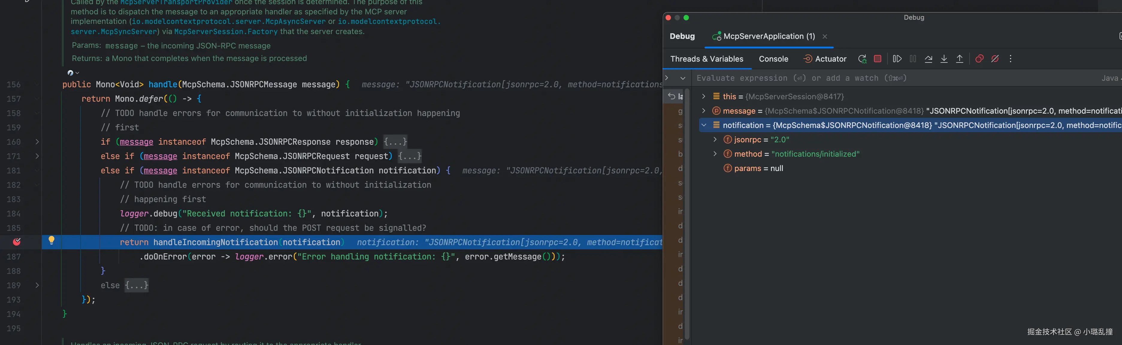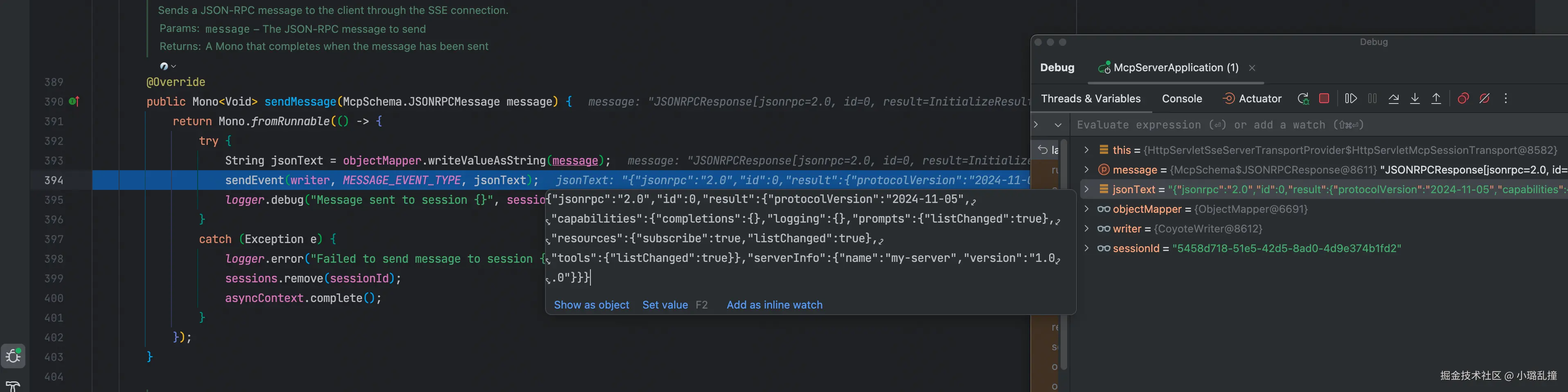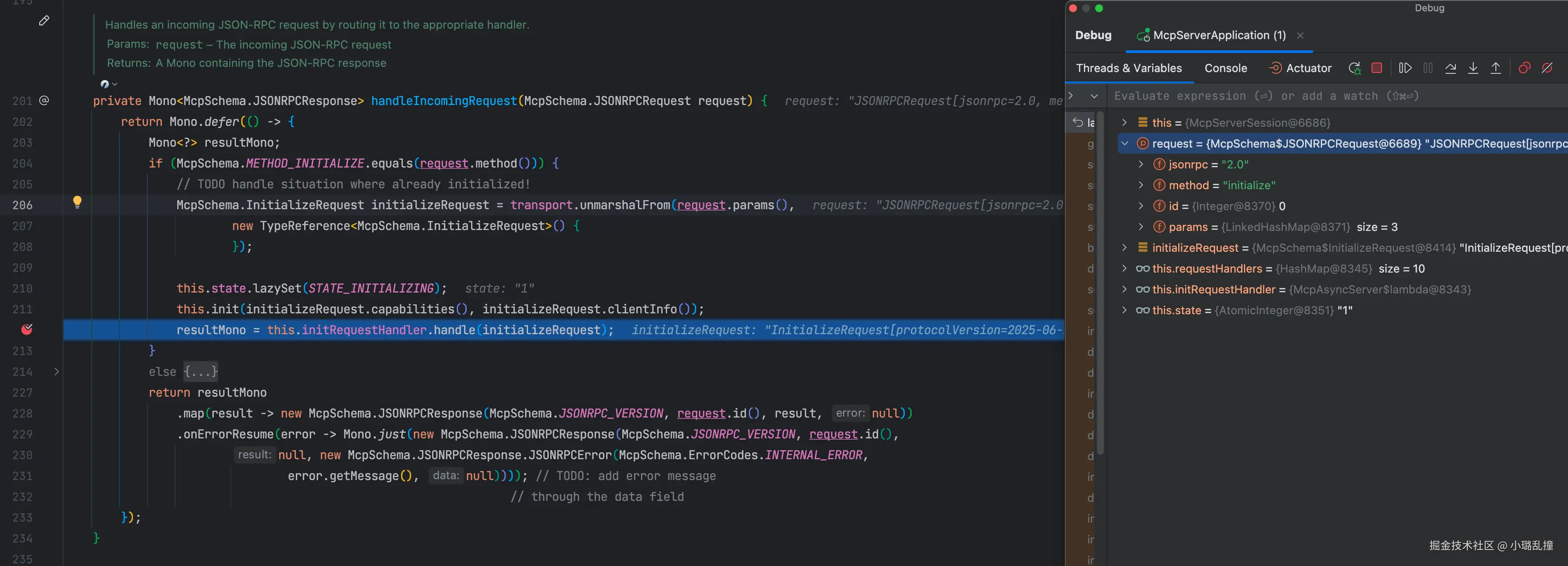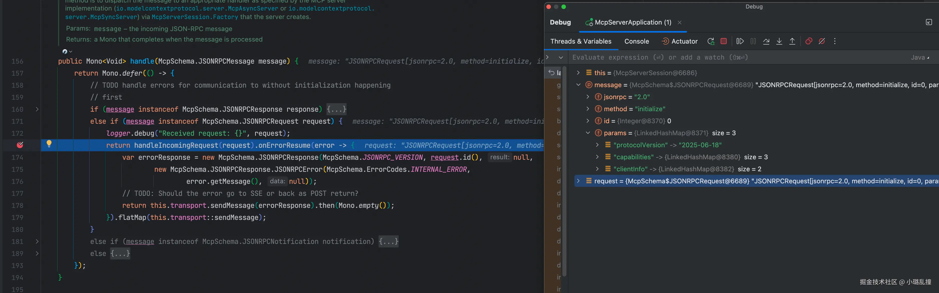 在前面的章节中,我们从架构、交互流程、核心源码三个角度剖析了 Spring AI MCP 的整体设计与关键实现,理清了各层之间的职责划分与调用关系。为了让大家能直观地看到 MCP 在实际运行时的交互过程,这一章将通过断点调试 的方式,以服务端源码的视角,深入演示 SSE 模式下客户端与服务端初始化的过程。在理解了初始化这个比较复杂的过程后,其他的过程也是非常类似的,感兴趣的同学可以按照下面的步骤搭建好环境后自行调试。