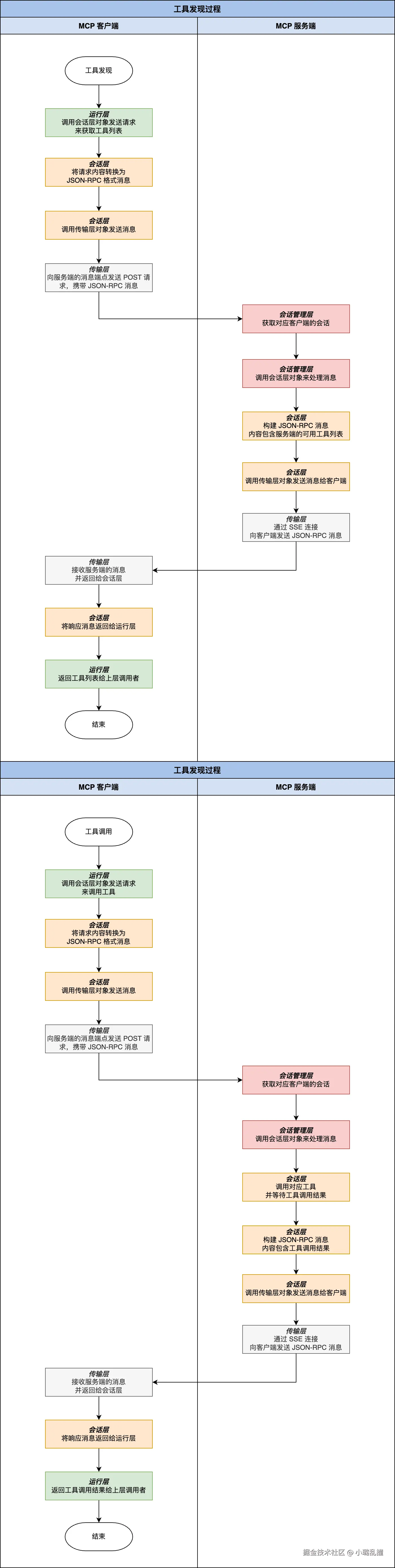 最后讲解工具发现、调用的过程,这个过程属于 MCP 的业务交互流程。其他的过程都是很类似的,因为源码对整个业务交互进行了非常好的抽象,所以每个业务流程在层次走向上都是非常类似的。