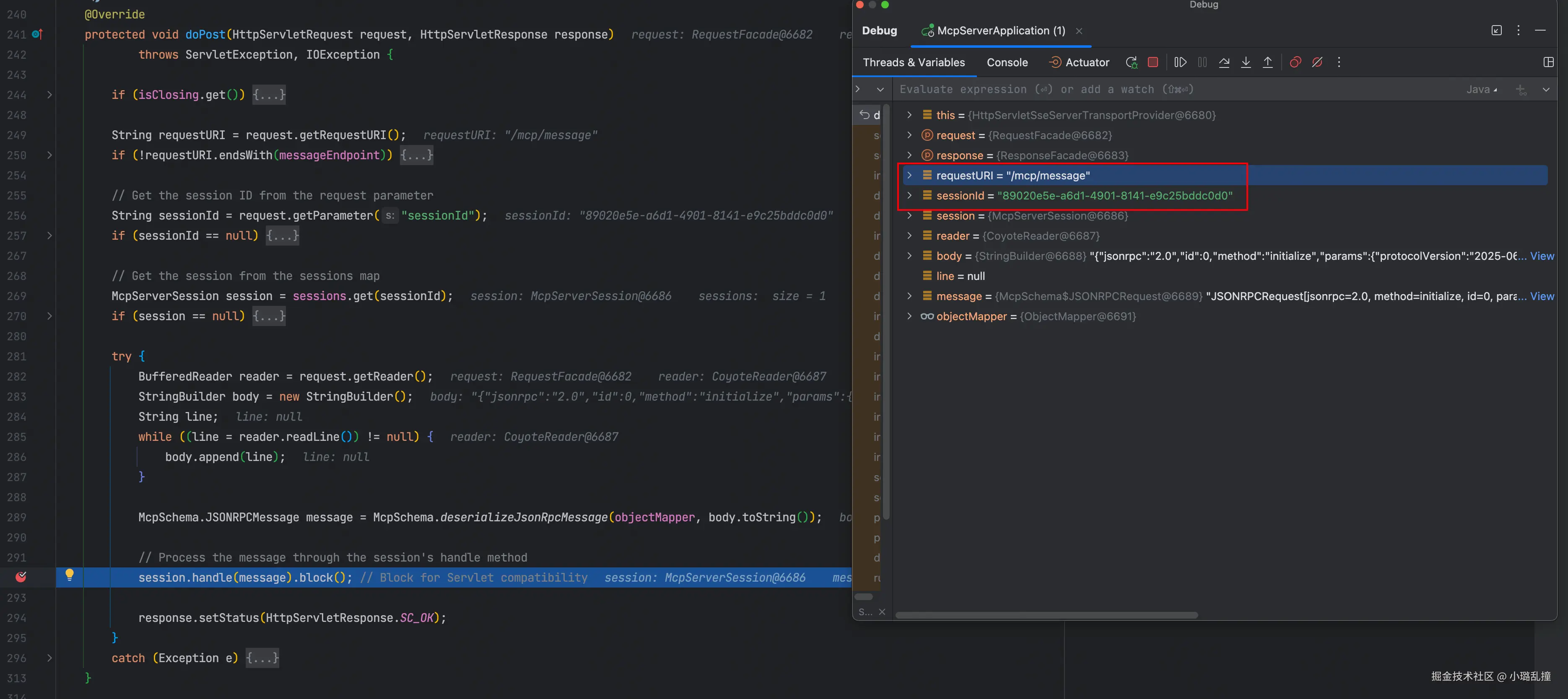 在第三章讲解初始化过程时,提到初始化过程包含两大步骤:初始化建立、初始化完成通知 ,而对于这两个步骤,客户端都会发送 POST 请求,因此这里首先需要把断点设置在服务端会话管理层 HttpServletSseServerTransportProvider 中接收 POST 请求的方法 doPost()。在 MCP Inspector 中触发这一步骤的方式就是点击 Connect 按钮,在连接完成后,就会发送 POST 请求触发初始化过程。