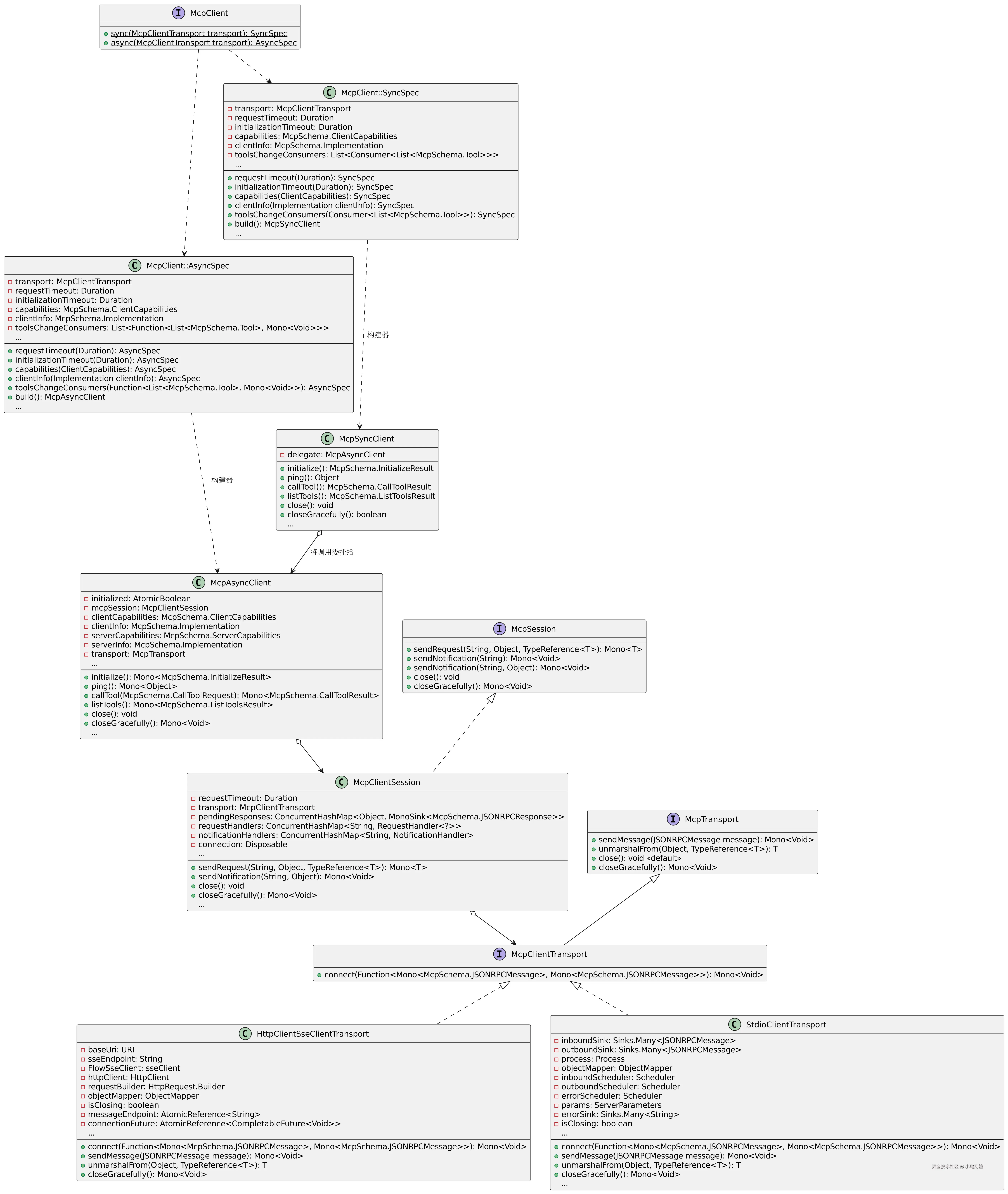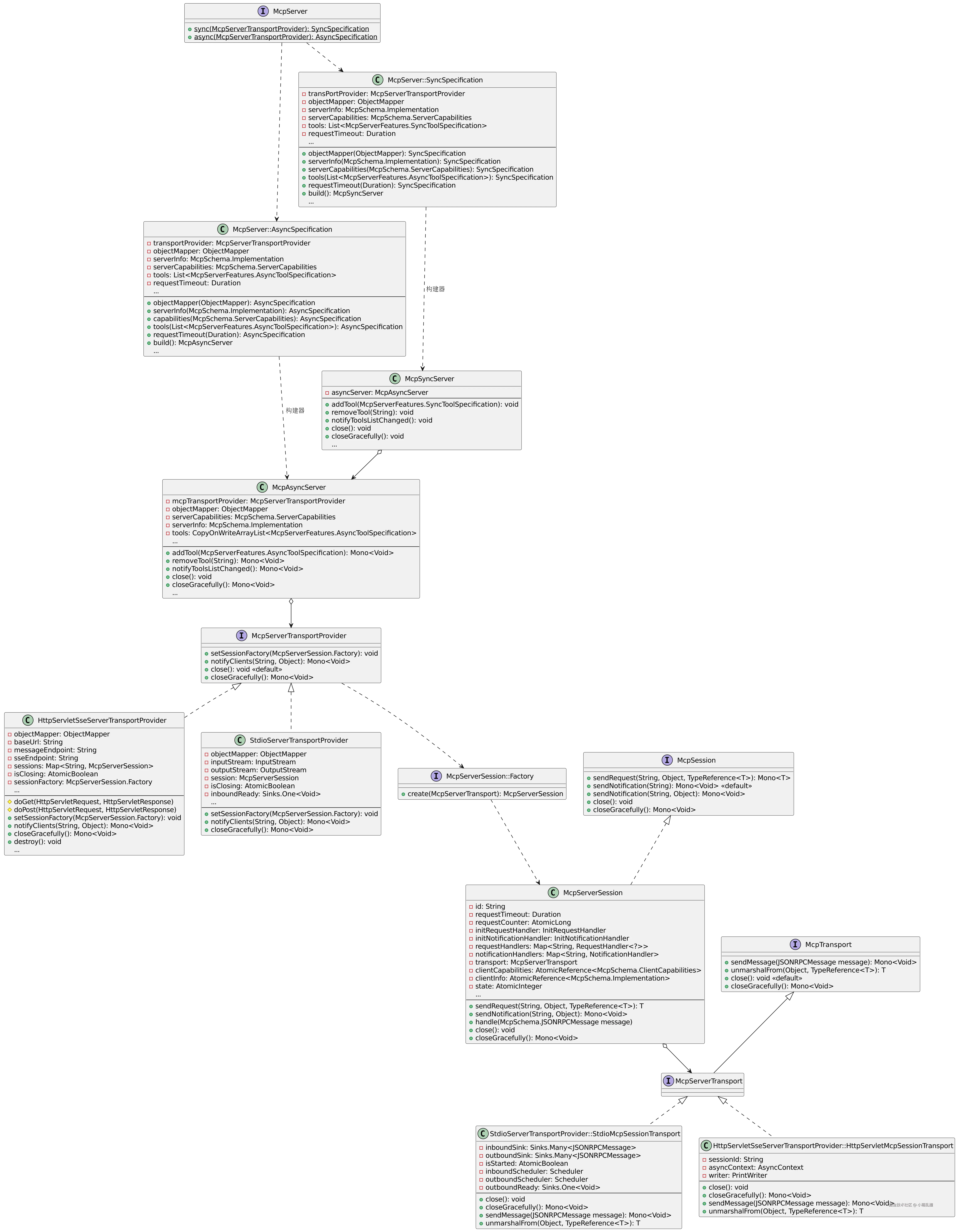 这里先给出 MCP 客户端、服务端的完整类图,后续会逐层拆分这个类图,自上而下地讲解各个层次涉及到的源码。这里我使用的源码版本为 0.10.0(github.com/modelcontex...),对应 Spring AI 1.0.0 版本内使用的 mcp 版本。