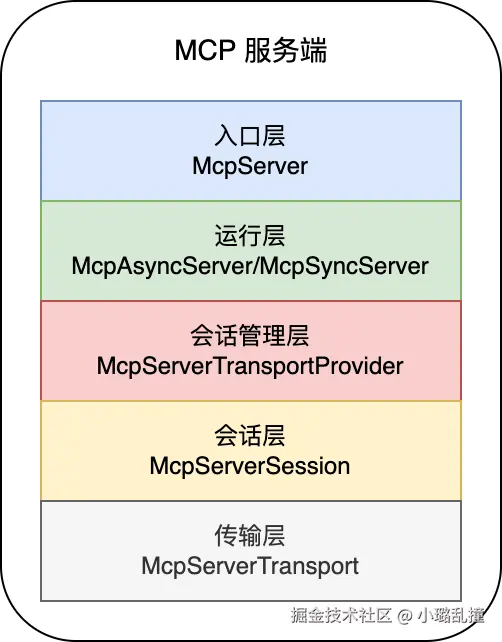 - 会话管理层 :这一层是 MCP 服务端特有的部分,用于管理多个客户端会话,对应的接口为 McpServerTransportProvider。其用于管理活跃会话的生命周期、向所有客户端广播消息、统一关闭与清理连接资源等,使得服务端可以同时维护多个客户端连接。