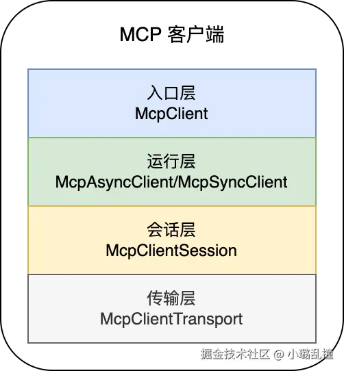 - 入口层 :这一层是 MCP 客户端/服务端对外的统一入口,对应的接口为 McpClient/McpServer。只需通过其工厂方法,并提供配置信息(如超时时间、能力配置等),就能以同步或异步模式创建运行层的客户端/服务端实例。入口层对下层的复杂实现进行了封装,对上层提供统一、简洁的构建入口,使得调用者无需关心传输方式与消息机制的差异。