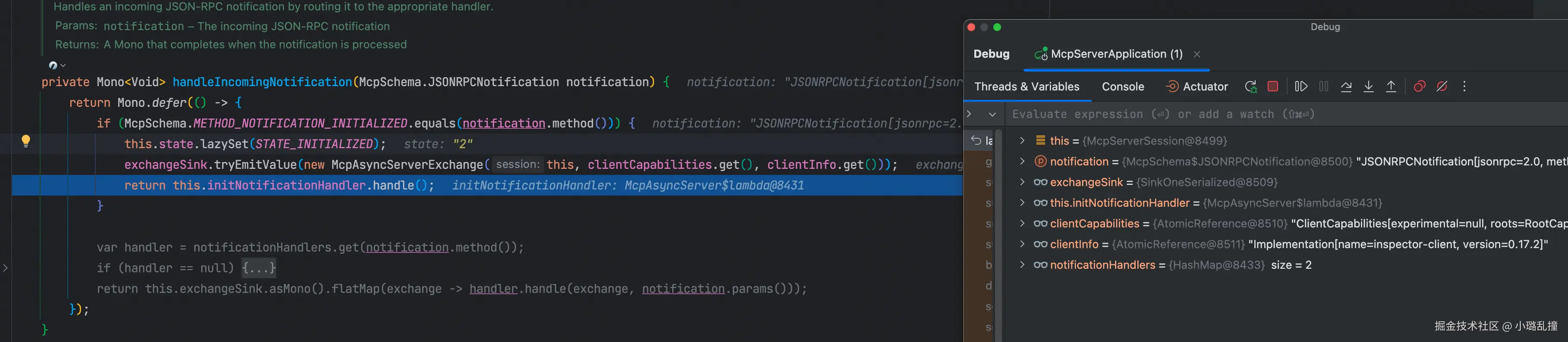 而这个处理器实际上并没有做任何事情,在运行层 McpAsyncServer 构造方法中 lambda 设置为 Mono::empty,即不做任何事。如下所示。